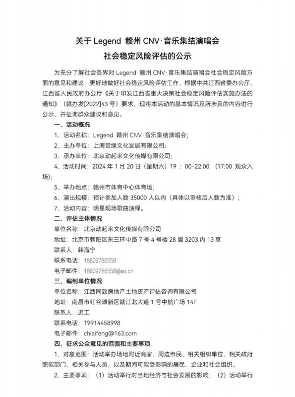 关于Legend 赣州CNV·音乐集结演唱会社会稳定风险评估的公示